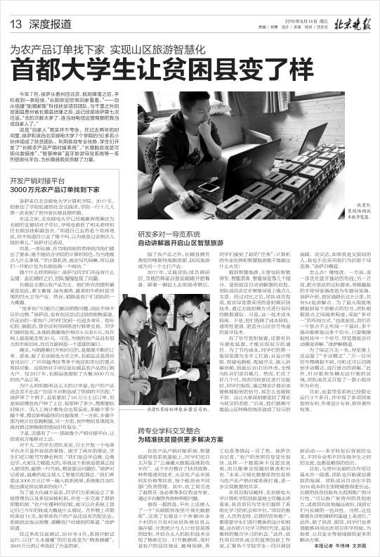 8月14日,《北京晚报》13版整版,以《首都大学生让贫困县变了样》为题,对我校“助顺邮我”科技扶贫团队在贵州省长顺县开展科技扶贫、助力外地经济社会生长相关事情的情形举行深度报道。