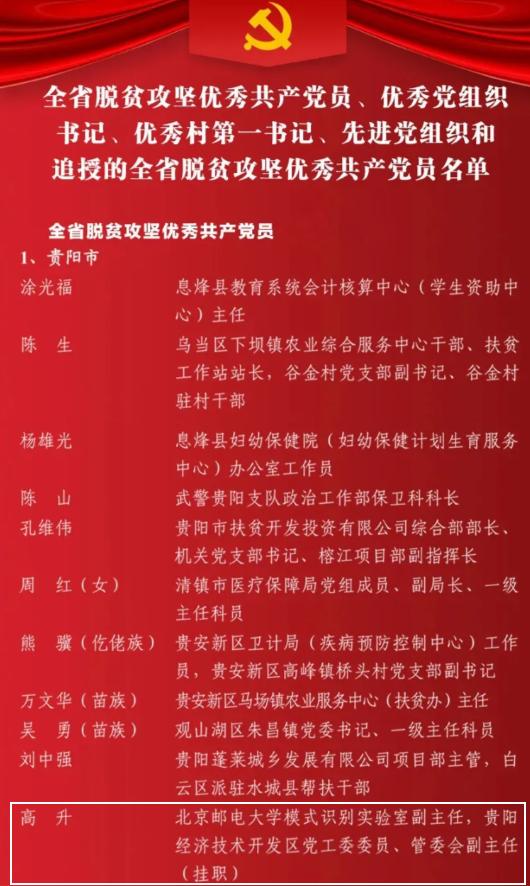 克日,贵州省召开2020年脱贫攻坚“七?一”表扬大会,我校挂职干部贵阳经济手艺开发区党工委委员、管委会副主任,信息与通讯工程学院高升副教授荣获“贵州省脱贫攻坚优异共产党员”称呼。