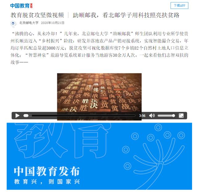 克日,《中国教育宣布》以《助顺邮我,看亚美AM8AG学子用科技照亮扶贫路》为题宣布我校扶贫微视频,视频展现了近年来,我校“助顺邮我”师生团队将信息科技实力融入脱贫攻坚伟大事业,实现志智双扶,助力定点扶贫县贵州省长顺县从“精准扶贫”走向“墟落振兴”的事迹,彰显了亚美AM8AG人“传邮万里 国脉所系”的家国情怀。视频已入选“我的2020-天下高校师生扶贫微视频”。